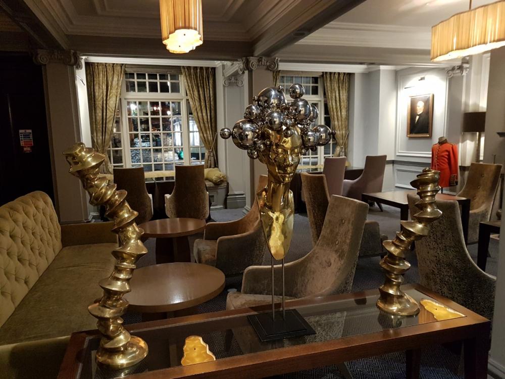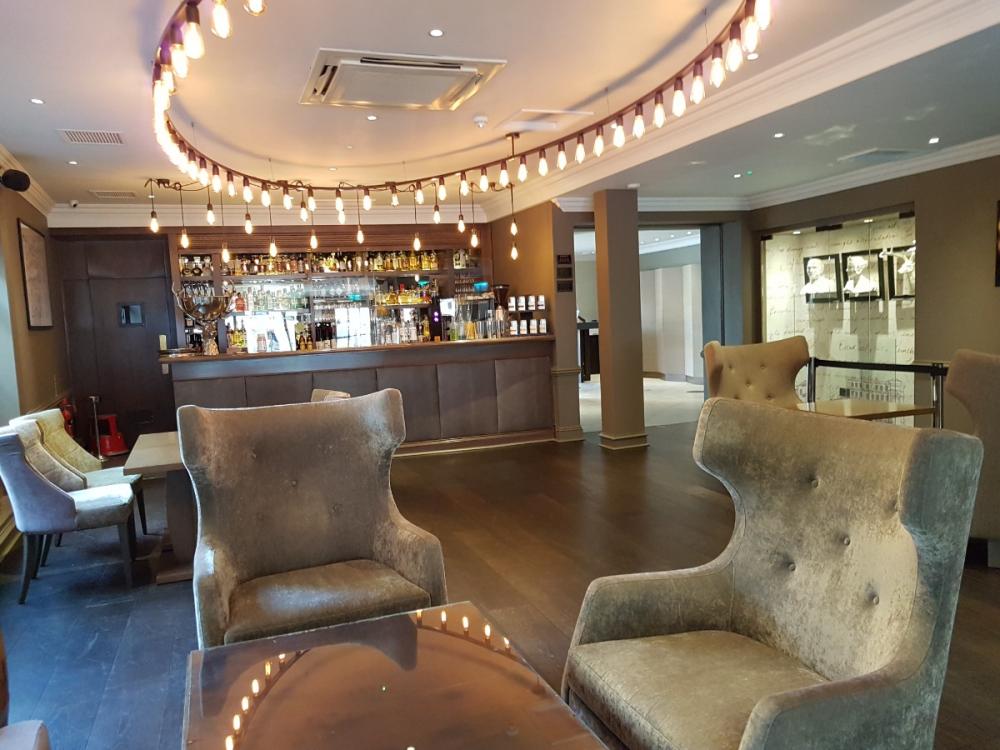 as, indeed, was the bar with its grey studded armchairs and a certain deference to Royalty thanks to a series of busts housed behind a glass façade...