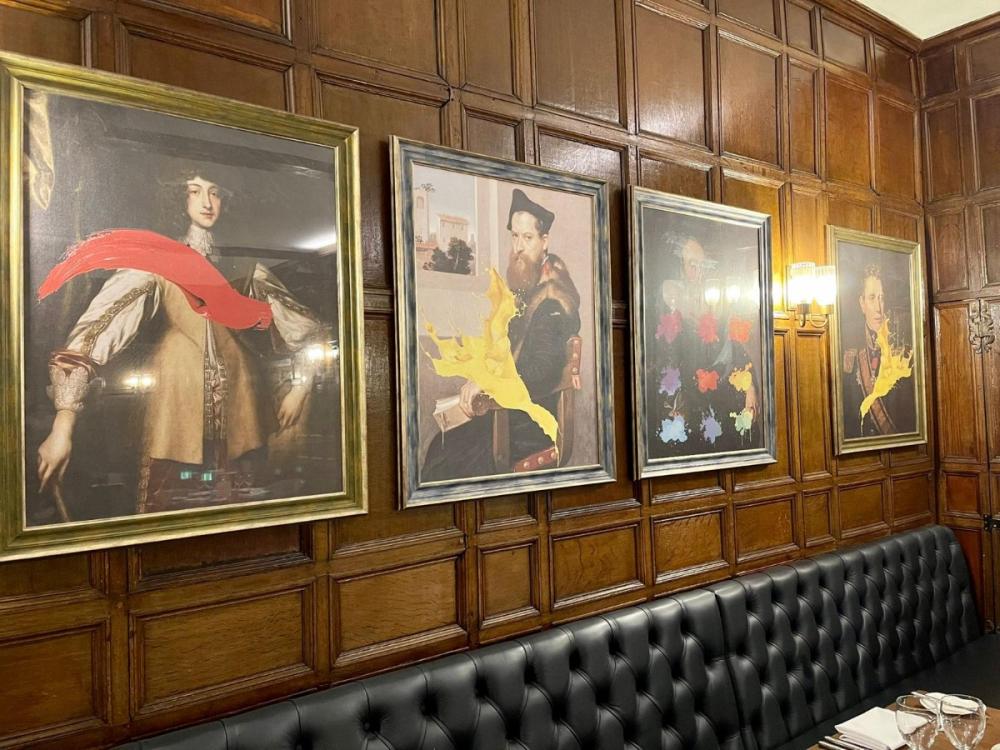 Not quite street artist Banksy, but someone has taken a series of traditional Elizabethan portraits and given them a modern makeover with splodges of primary colours designed to lift the darkness of the room’s 16th century oak panelling.