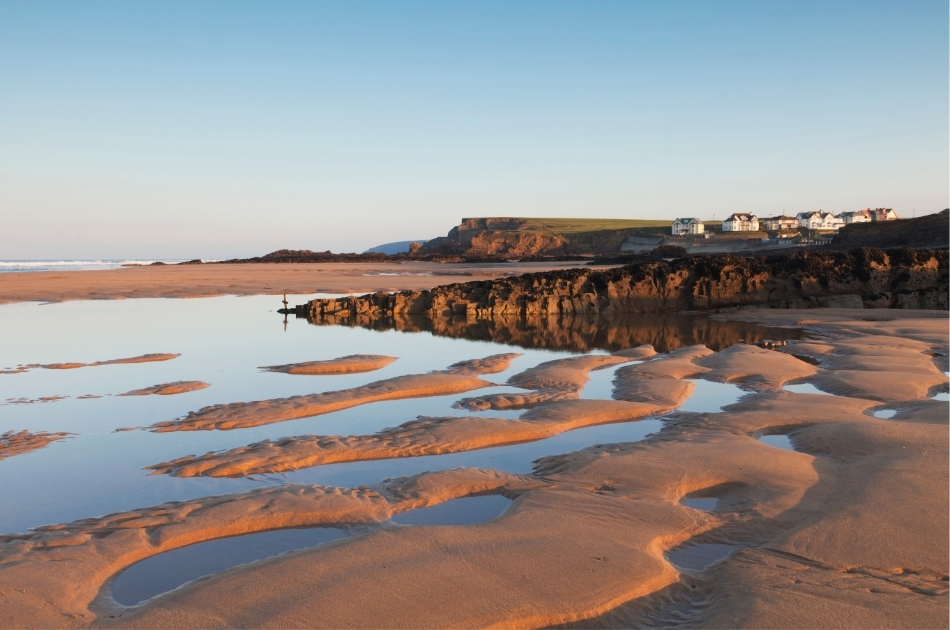 Widemouth Bay, three miles south, is the family beach—wide enough that even on a packed August weekend, you can find space. The rock pools at low tide are genuinely excellent. Crabs. Anemones. Kids with nets having the kind of summer afternoon that doesn’t require a ticket or a reservation.