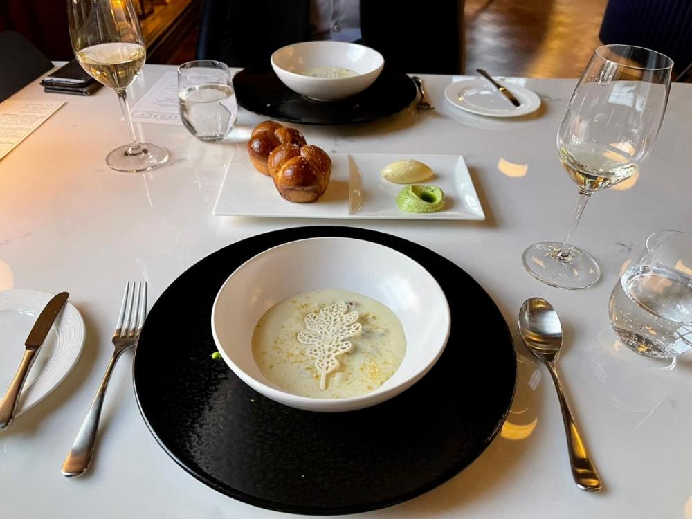 ... Sommelier trained Derek was first to break the ice as he brought in the Jersey Royal Velouté and two Parkerhouse bread rolls complete with cultured and goats herb butters.