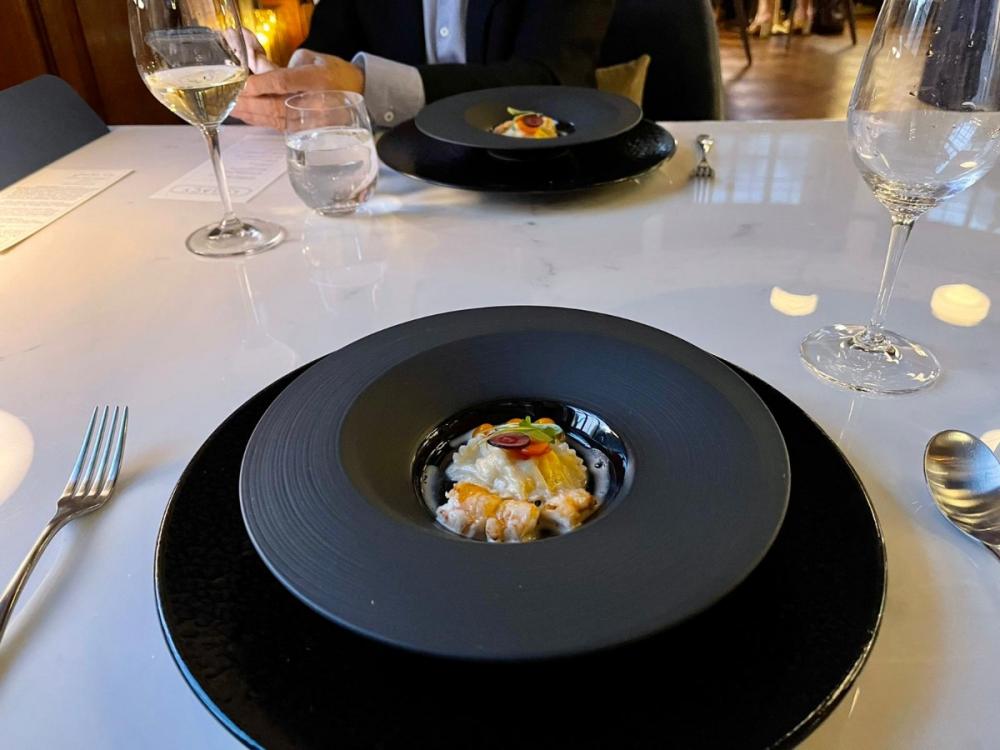 Soon after the opening volley of canapes – Lindisfarne oyster with a fermented grape verjus dressing, smoked cod roe and ham hock tartlet…