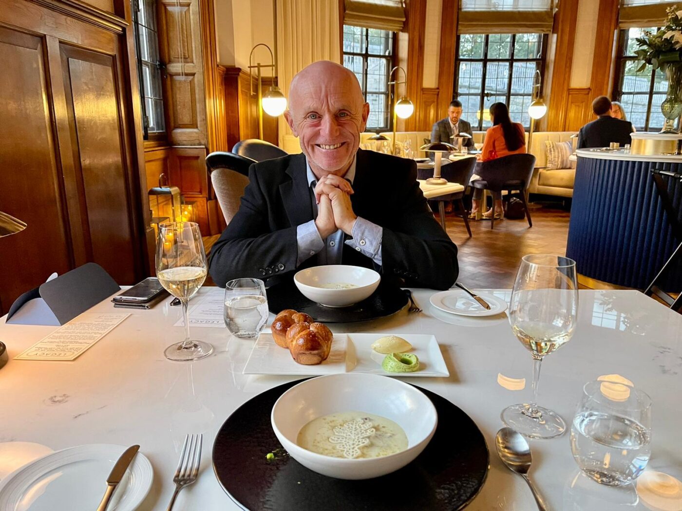 Looking as fine as the food itself in her long, elegant, red evening gown, Emma, daughter of a Howden farming family, riveted us with her story of how she’d abandoned the UK’s ‘overly theoretical’ catering schools, in favour of one of the Netherlands finest. A quarter of the price, hugely practical and gateway to her now five-star career at The Grand, she had enjoyed every minutes of her time on mainland Europe: here was a girl with a true understanding of the word thrift! Margaret Thatcher would have been proud! Her dad already was.
