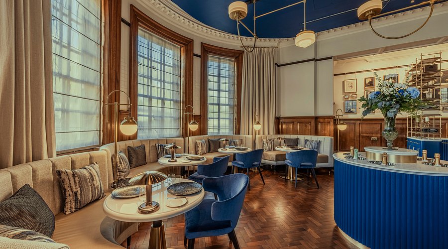 The setting is bold yet elegant, seating up to 26 covers, with interiors demonstrating the building’s iconic and historic features with modern twists, including blueprint murals, oak panelling, sculptural lighting, industrial ironwork and crisp colour contrasts.