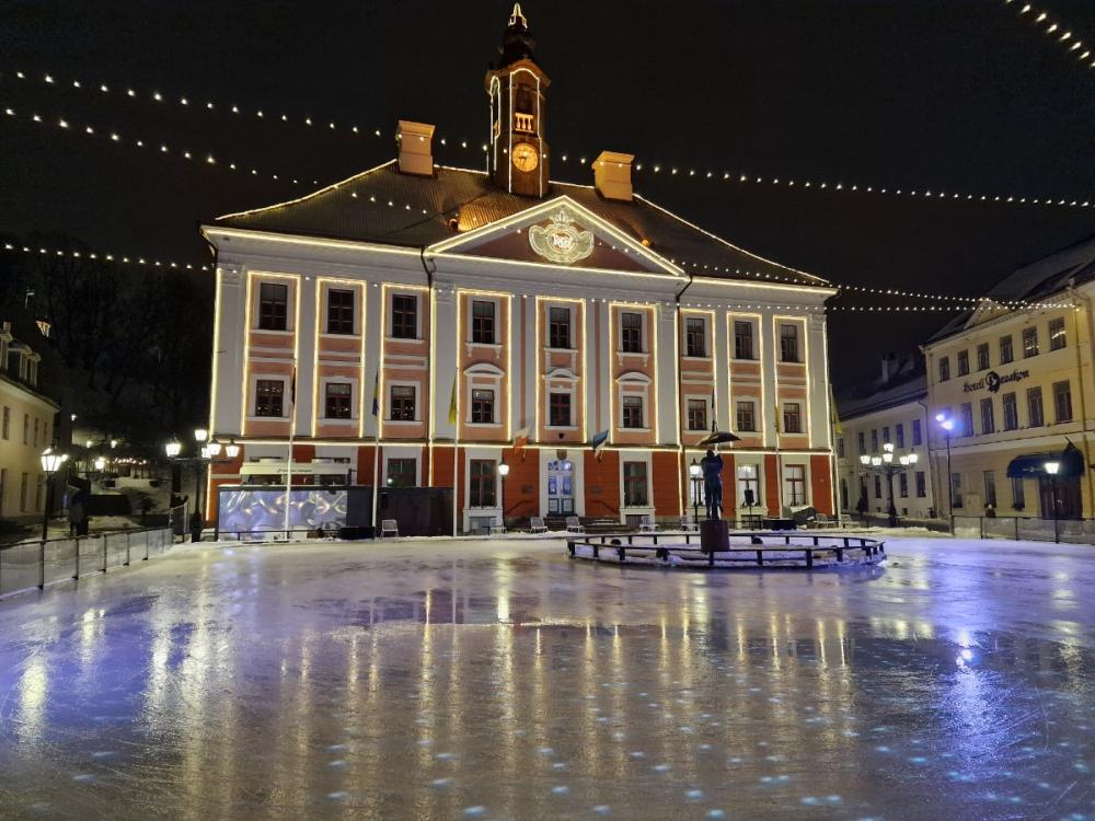 Tartu Town Hall with its famous Kissing Students, currently in the middle of the mobile winter ice rink