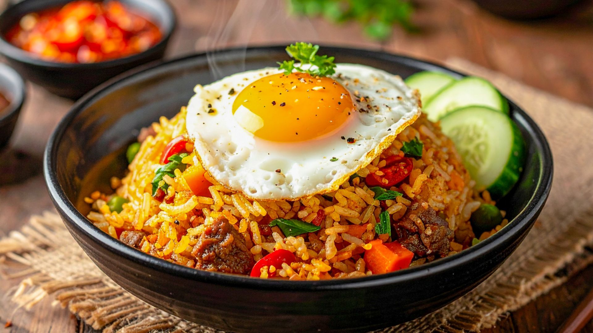 Indonesia’s national dish—fried rice wok-tossed with sweet soy sauce (kecap manis), garlic, shallots, and chilli, topped with a fried egg and served with prawn crackers and pickled vegetables. Every warung (street stall) and hotel restaurant serves their version; the best achieve that crucial wok hei (breath of the wok) that distinguishes good fried rice from great. Additions might include chicken, prawns, or the beloved bakso (meatballs). Eaten for breakfast, lunch, or dinner, nasi goreng represents Indonesian cooking at its most democratic and delicious. The fried egg must have runny yolk; this is non-negotiable.