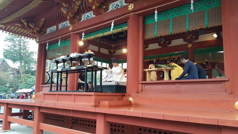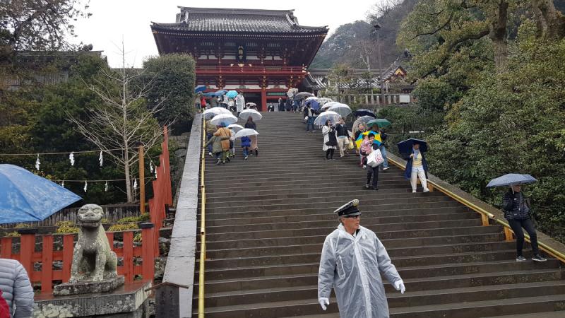 The Tsurugaoka Hachimangu Shinto Shrine hid itself behind a hazy blur of rain, whilst determined waterproofed officials ushered everyone up the left hand side of its main steps and down the right, as an authentic religious wedding ceremony obliviously took its course in one of the main temple buildings. Hundreds of uninvited guests captured the moment for posterity on their cameras and mobiles. I had less than an hour in which to digest and assimilate one of Kamakura city’s most important shrines. Cultural indigestion beckoned!