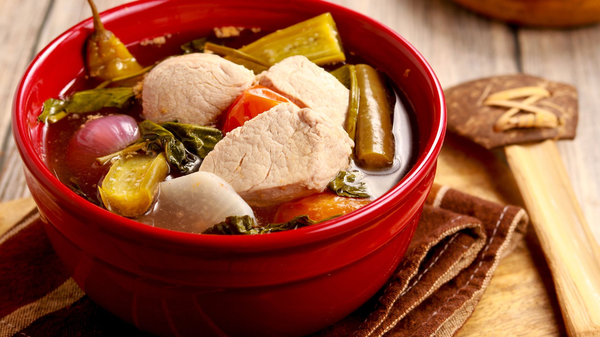 This sour soup defines Filipino comfort—tamarind provides the signature tartness, though green mango, guava, or kamias (bilimbi) create regional variations. Pork belly, prawns, or fish simmer with tomatoes, onions, and water spinach until the broth achieves perfect balance between sour and savoury. Served in a communal bowl for ladling over individual rice portions, sinigang cuts through humid heat and satisfies completely. Every restaurant offers their version; the best ones taste like someone’s grandmother has been stirring the pot since dawn. The antidote to everything, Filipinos say, and they’re not wrong.