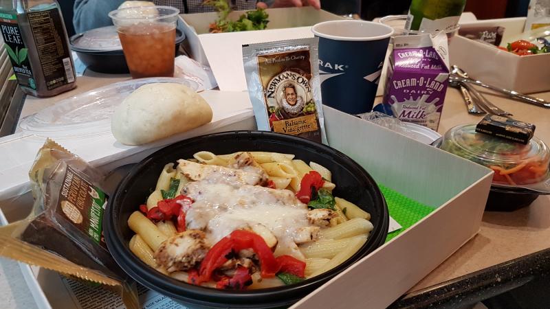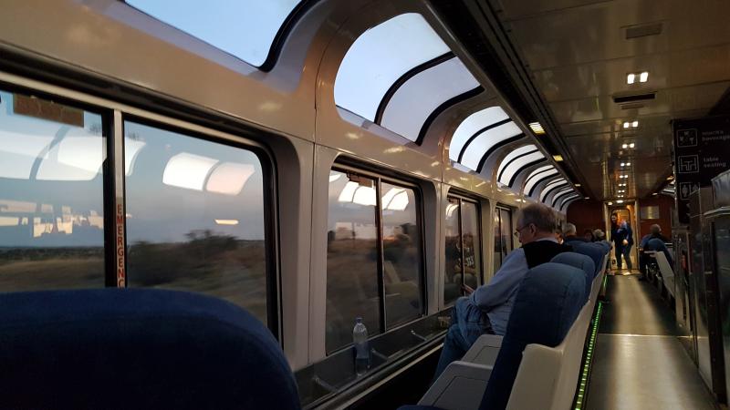 The penne pasta with chicken was piping hot and soon after more people filed into the dining car. The tables were simple Formica but we did get ‘silver’ cutlery, albeit plastic coated, and a neatly folded napkin.