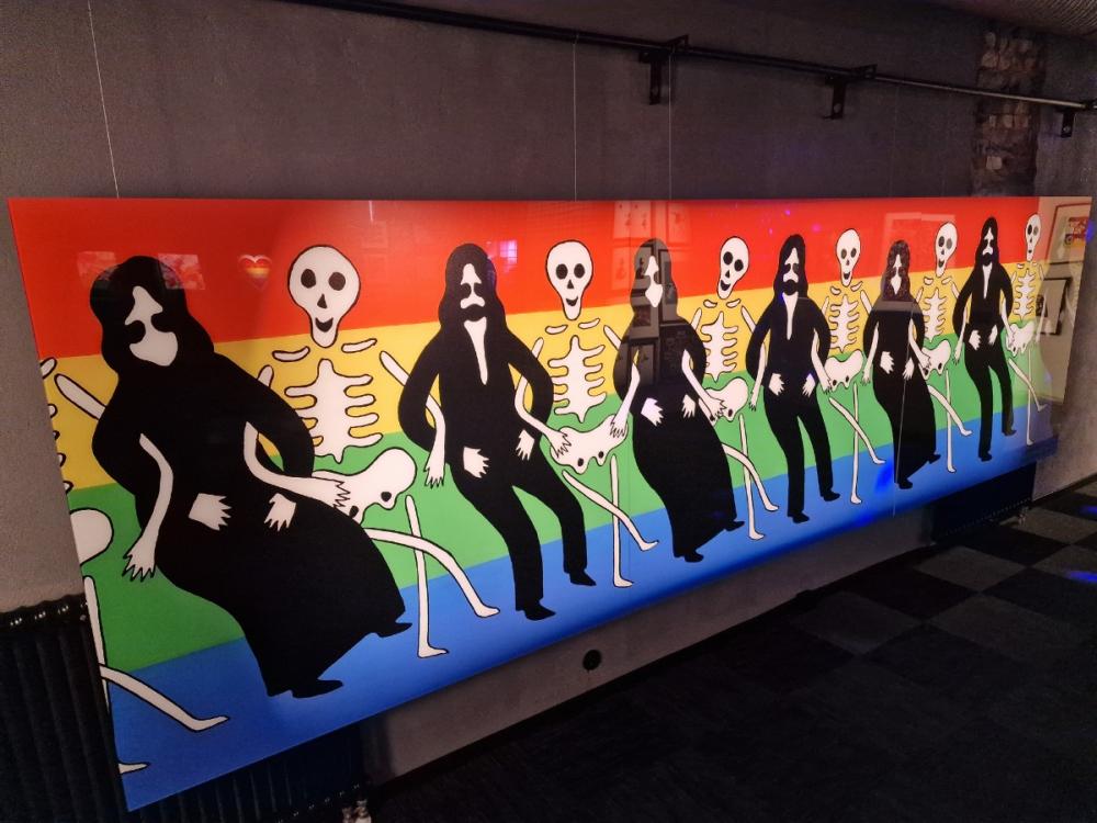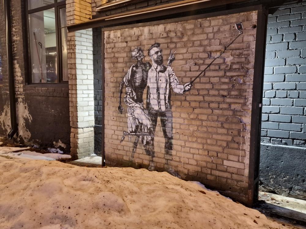 Outside, with snow on the ground, temperatures were falling, but Estonian ‘Banksy’ Edvard von Longus’ playful mural still managed to bring a smile to our face with his ‘Dance with Death’ wall painting: a skeleton playfully poses for a selfie to the rear of an unwitting ‘human’.