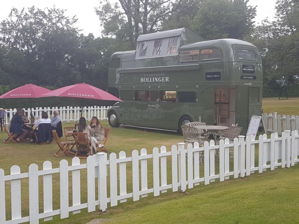 We stepped onto the Bollinger double decker standing majestically just across from The Cultra Inn, almost oblivious to the fact that its engine wasn’t running and neither was there a driver in sight…..just a raft of beautifully manicured tables alongside and the offer of champagne.