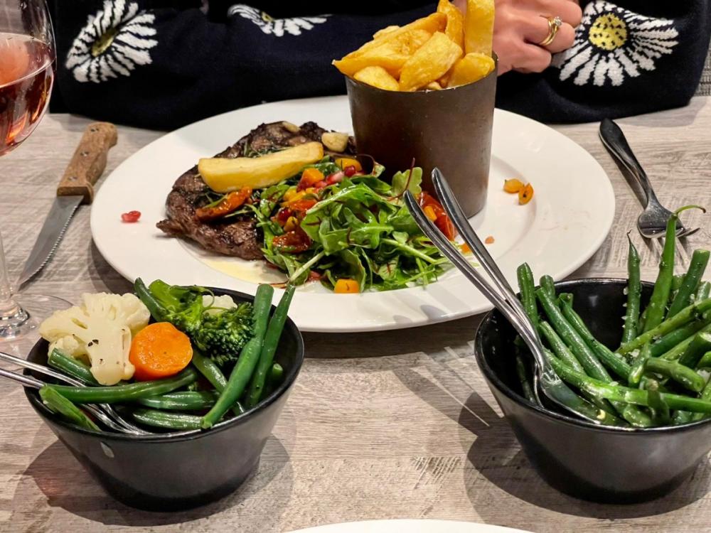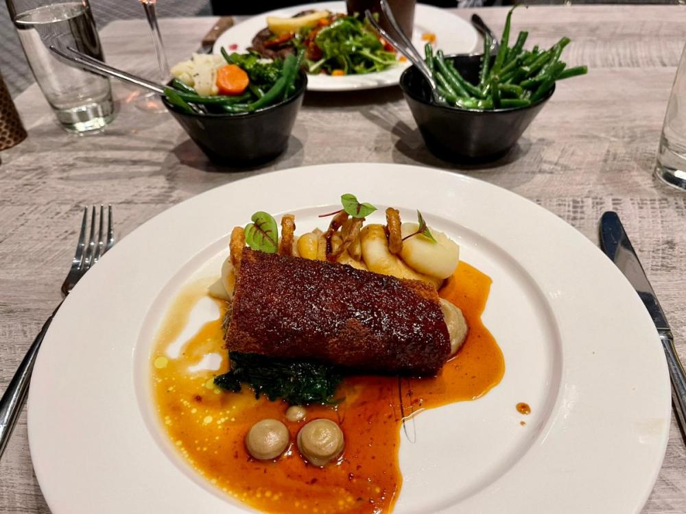 Mains also include: Braised Ox Cheek with Carrot, Celeriac and Dauphinoise Potatoes and Jus. Or a lighter choice might be; Pan Fried Sea Bass with Tomato, Squash and Buckwheat Broth with Fried Garlic Kale.