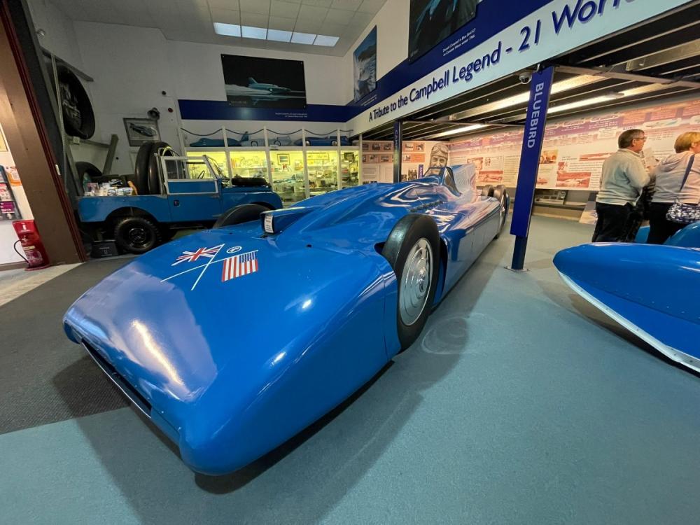Highlights include full sized replicas of the 1935 Blue Bird car, 1939 Blue Bird Boat K4 and 1967 jet hydroplane Bluebird K7.